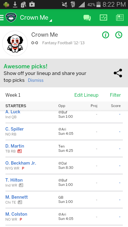 Ya well I had pick 12 aND literally all the damn rbs were gone so I went beckbeckham and luck consecutive and then managed ty Hilton somehow. I like my team and I am taking a chance on a bunch of rb. I found forsett, Anderson last year with this as type of team. I like to find rbs