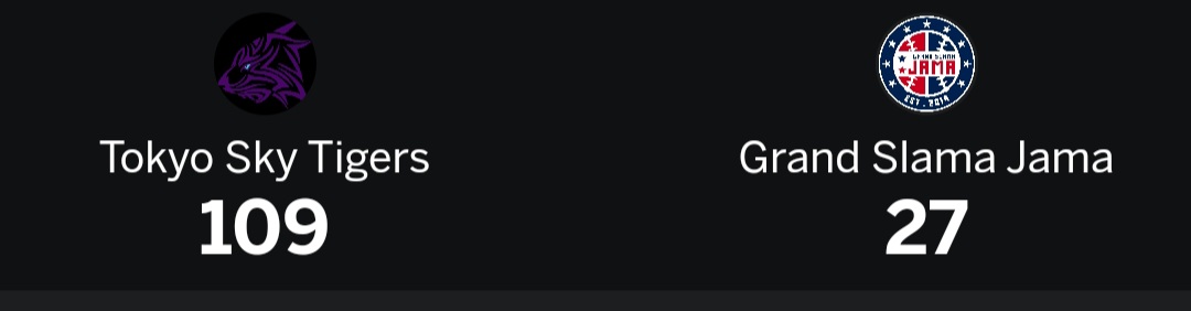 1 | Tokyo Sky Tigers | 5 | 0 | 0 | 1.000 | -- | 86 |