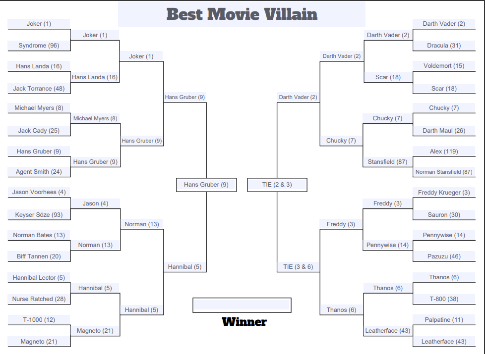 That is an awesome bracket. May prove the best tournment yet. Just proving once and for all its cool to be a villain!