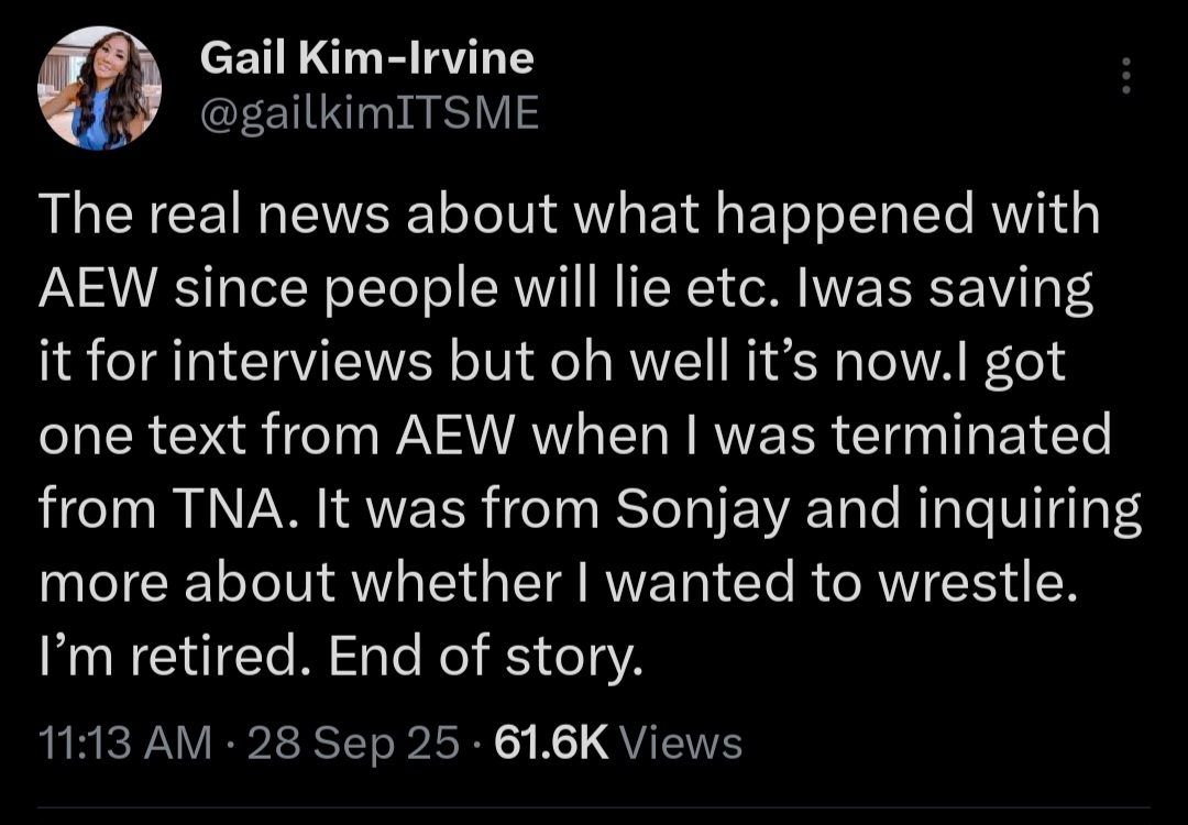 Is she quite known to be retired and done? Unless it was a casino gauntlet spot, I don't see any other spot AEW would bring her in for a match. I will also say this: Rhio is one of the least sexualised wrestlers in wrestling. It's a very weird complaint imo. The only person with a child like gimmick I ever seen that was ever treated in the way Kim is on about is that time Alexa pinned Randy. A