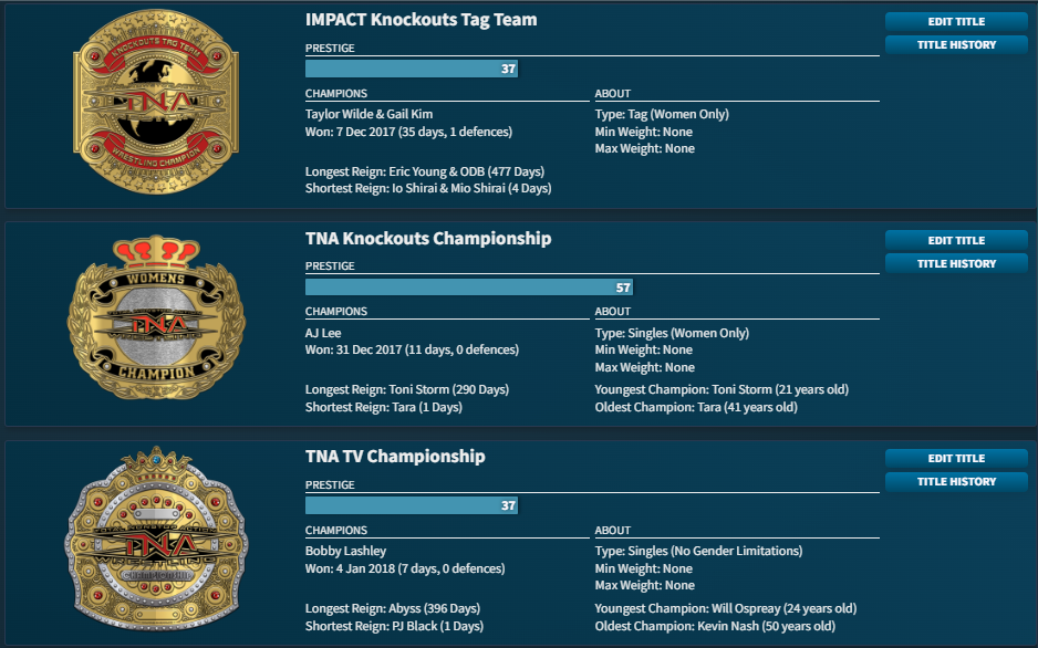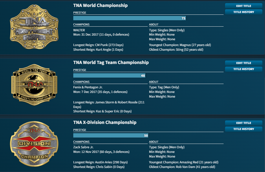 so I can sign people lmao. Anyway here is my current champions. I'll show you the history of any title you want to see. I just got to 2018, almost been booking it a year in game. But yeah any champions you wanna see the history of, just ask.