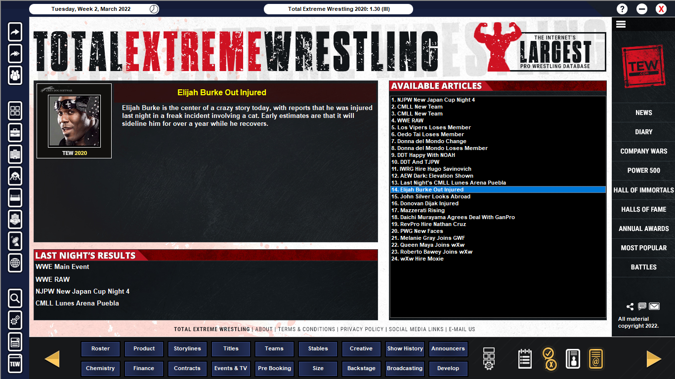 Chronicles 1992 2.0 dropped today, and among other things, it apparently fixes the fact that NJPW and AJPW die financially a few years in. I've simmed the first 2-and-a-bit years, with WrestleMania X recently having taken place.