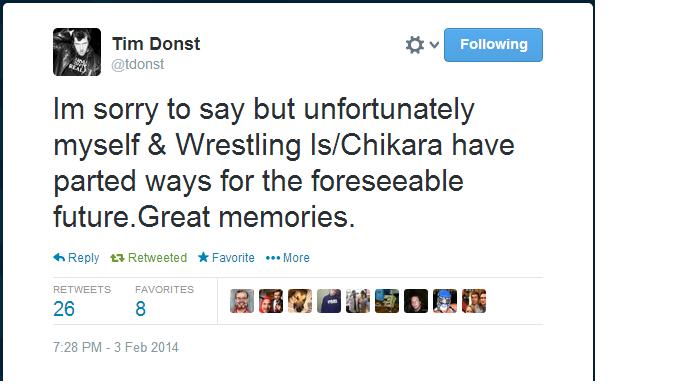 Now, no word on any possible matches just yet as we're still settling from the National Pro Wrestling Day aftermath but we can start off with some bad news as to who won't be there as Tim Donst announced on Twitter he and Chikara have parted ways for the foreseeable future.