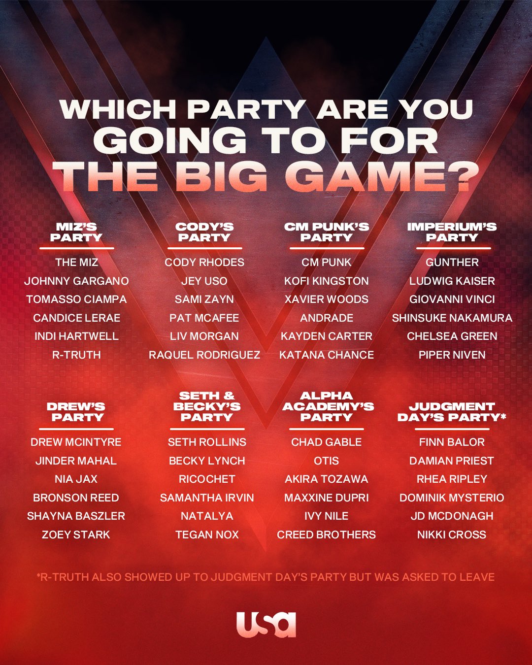 Show up at Punk’s party with a Young Bucks shirt, get kicked out, go to Cody’s party to smoke with Liv, and at halftime I’m rolling over to Drew’s party to talk shit about Punk, before going back to Cody’s before halftime is over.