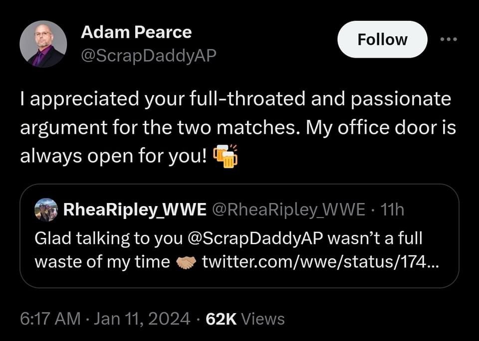 Full-throated and mentioning his office door is open? This has to be the most thinly veiled quid pro quo casting couch reference I’ve ever seen. No wonder Rhea is the face of WWE. She uses HER face. :hayden3